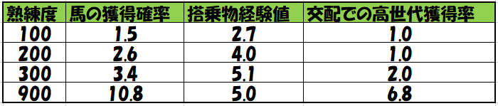 調教の熟練度ごとの数値は公表されていないため、